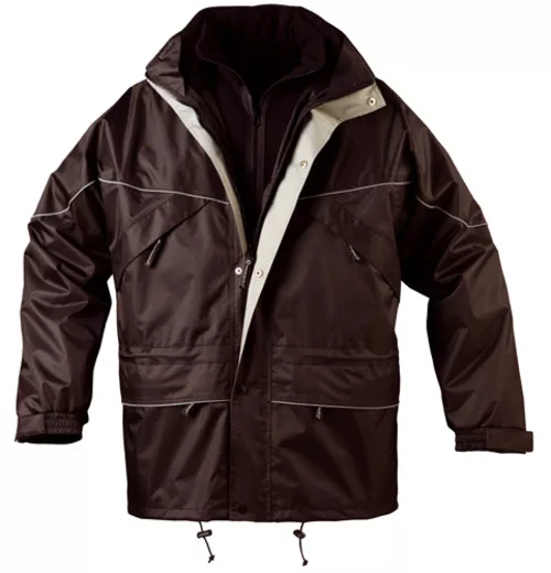 * PVC-vel vízhatlanított poliészter külső, selymes taft belső * 3 az 1-ben modell: kicipzározható, 280 g/m?, zsebes, polár belső pulóver * erős cipzár patentos fedővel, rejtett kapucni, polárbetétes gallér * négy cipzáras külső-, egy belső zseb