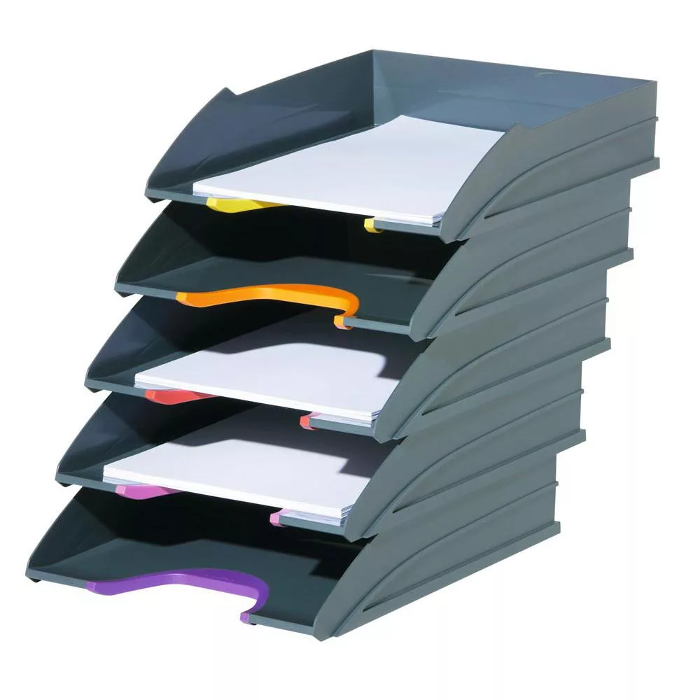 Irattálcák, fehér, különböző színű fogantyúkkal, egymásra rakható, 5 darabos csomag
