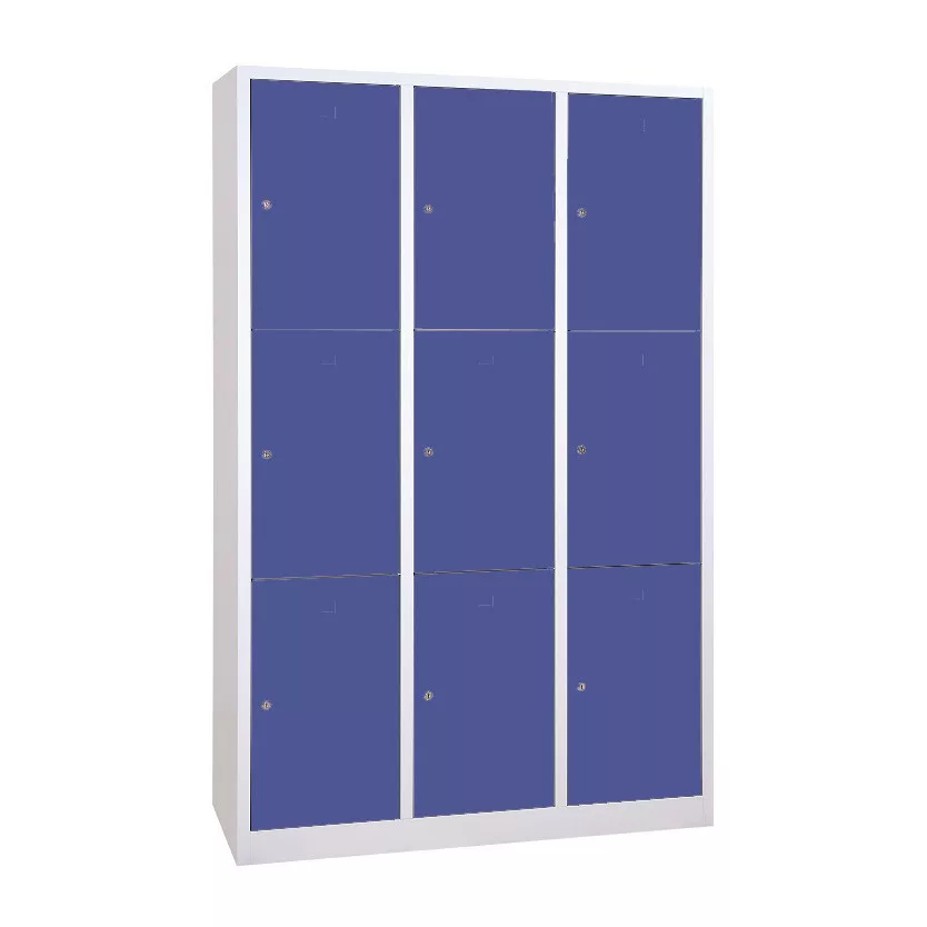 Iskolai fém öltözőszekrény, 9 rekeszes (3×3), 1900mmx1190mmx450mm, Szürke/kék