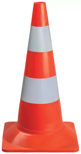* stabil talpon álló közúti bója * széles, fényvisszaverő vízszintes csíkok, piros-ezüst szín *  75 cm magas, 4 kg súlyú PVC anyag