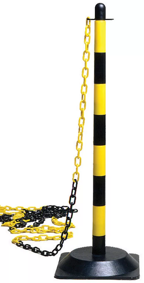 * lánc: sárga-fekete (GAN70040), 6-os láncszemek könnyű polietilén anyagból, 25 m hosszú, 5 méterenként bontható * összekötő szemek: nyitható (GAN70053), vagy S alakú (GAN70055) változatban * tartóoszlop: sárga-fekete (GAN70070)* 90 cm magas, könnyű polietilén anyag, praktikus, vízzel tölthető talppal együtt