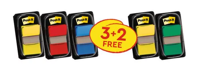 Jelölőcímke, műanyag, 3+2x50 lap, 25x43 mm, 3M POSTIT, vegyes
