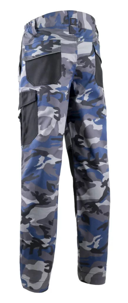 * Kammo kék/ terepszínű elasztikus deréknadrág* twill szövésű, 270 g/m2 vastag, 62% pamut és 35% poliészter és 3% elasztán kevertszálas alapanyagOldalán gumírozott derék + övbújtatókMegemelt hátrészJelölés a derekán2 oldalzseb oxford megerősítéssel2 tépőzáras hátsó zseb 1 tépőzáras, megerősített cargo zseb + több rekeszes kialakítás1 Oxford vonalzó zseb több rekeszes kialakítássalD-gyűrűElőformázott térdrészOxford erősítés a térdnélA száron még 5 cm-es lehajtási lehetőségKontrasztos varrás Fényvisszaverő díszcsíkokTripla biztonsági varrás a legsérülékenyebb helyekenKarcsúsított szabás