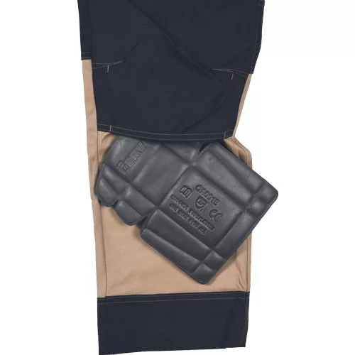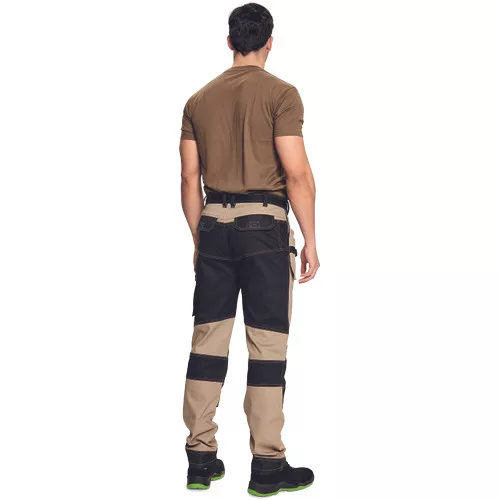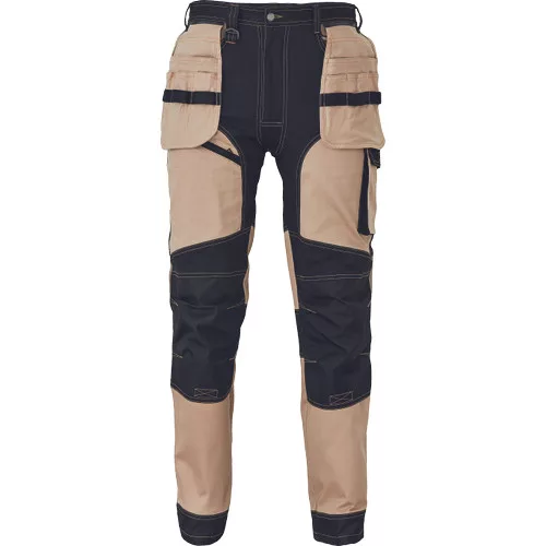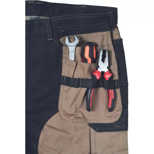 • férfi munkanadrág rugalmas derékkal • 2 oldalsó zseb, két szerszámtartó zsebbel elöl • D-gyűrű • 1 oldalsó zseb a lábon hajtókával • 1 oldalsó zseb cipzárral • 2 hátsó hajtókás zseb • megerősített térdrész, térdvédőtartó • 5 cm-rel meghosszabbítható nadrágszárak • a nadrág hátsó, alsó része megerősített • dekoratív varratok • 265 g/m2