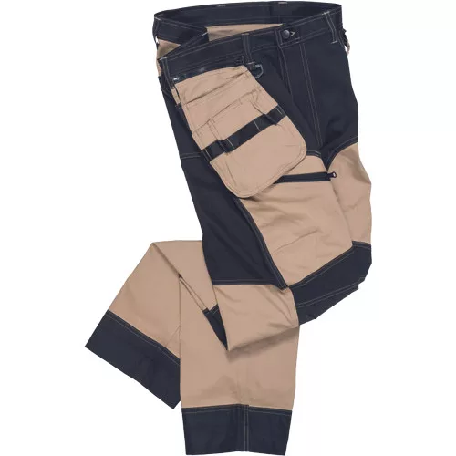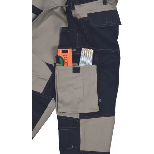 • férfi munkanadrág rugalmas derékkal • 2 oldalsó zseb, két szerszámtartó zsebbel elöl • D-gyűrű • 1 oldalsó zseb a lábon hajtókával • 1 oldalsó zseb cipzárral • 2 hátsó hajtókás zseb • megerősített térdrész, térdvédőtartó • 5 cm-rel meghosszabbítható nadrágszárak • a nadrág hátsó, alsó része megerősített • dekoratív varratok • 265 g/m2