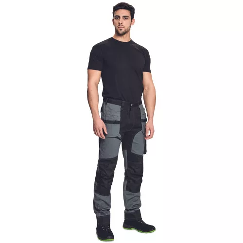 • férfi munkanadrág rugalmas derékkal • 2 oldalsó zseb, két szerszámtartó zsebbel elöl • D-gyűrű • 1 oldalsó zseb a lábon hajtókával • 1 oldalsó zseb cipzárral • 2 hátsó hajtókás zseb • megerősített térdrész, térdvédőtartó • 5 cm-rel meghosszabbítható nadrágszárak • a nadrág hátsó, alsó része megerősített • dekoratív varratok • 265 g/m2