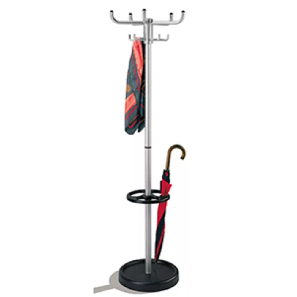 Kabáttartó, átmérő x magasság 500 x 1750 mm, forgatható akasztókorona, 2 x 5 kabátakasztó, esernyőtartó, alumínium ezüst/fekete