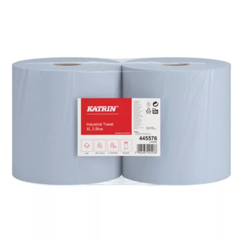 Katrin Industrial XL ''750'' tekercses ipari kéztörlő, 28 cm átmérő, 187,5 méter, 750 lap, 2 rétegű, kék, 2 tekercs/zsák