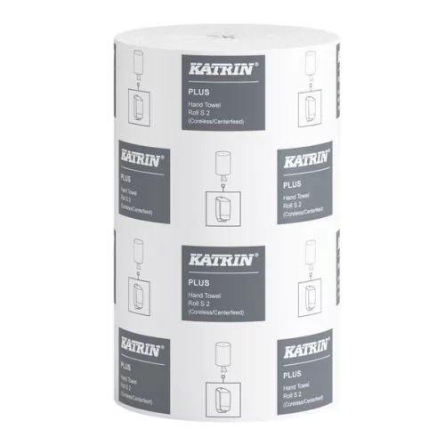 Katrin Plus S/60 tekercses kéztörlő, 14cm, 2 rétegű, hófehér, 240 lapos, 60 méter/tekercs, 100% cellulóz, 12 tekercs/zsák
