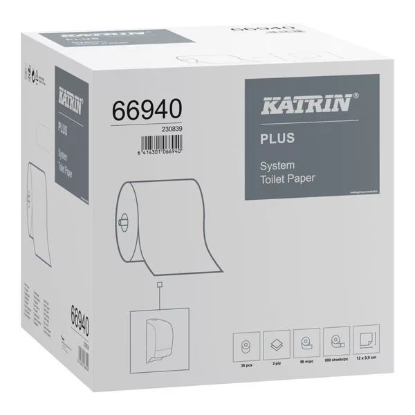 Katrin Plus System Toilet 800 toalettpapír (wc papír), 2 rétegű, hófehér, 800 lapos, 96 méteres, 36 tekercs/karton