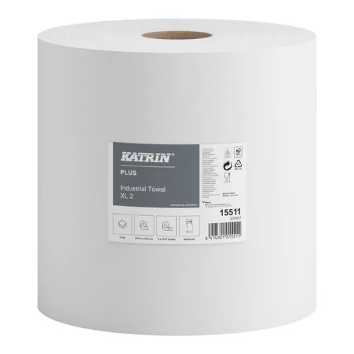 Katrin Plus VF XL ipari kéztörlő, 24cm átmérő, 234 méter, 1017 lap, 2 rétegű, hófehér, 3 tekercs/zsák