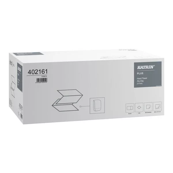 Katrin Plus Zig Zag ''S200'' V hajtogatott kéztörlő (Zig Zag, V hajtott), 1 rétegű, hófehér, 100% cellulóz, 21,3x22,9 cm, 200 lapos, 20 csomag/doboz
