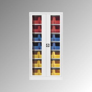 Kétajtós szekrény betekintőablakkal, 5 polccal, felszerelt, széxméxma 950x420x1950 mm, dobozok: 4x méret. 3z piros, 8xgr. 3z kék, ral 6011/6011