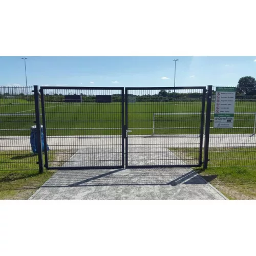 Kétszárnyú nyílókapu, 2 szárnyú, 50x200 mm-es hálós töltet, 60x40 mm-es keret, 80x80 mm-es oszlopok, szélesség x magasság 2000x1200 mm, horganyzott, ral 6005