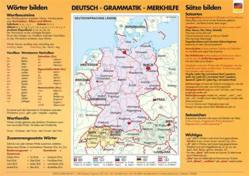 Az A3 méretű német nyelvi asztali alátét egyik oldalán a szó és mondatképzéssel, a hátoldalon a szófajokkal kapcsolatos tudnivalók találhatók.