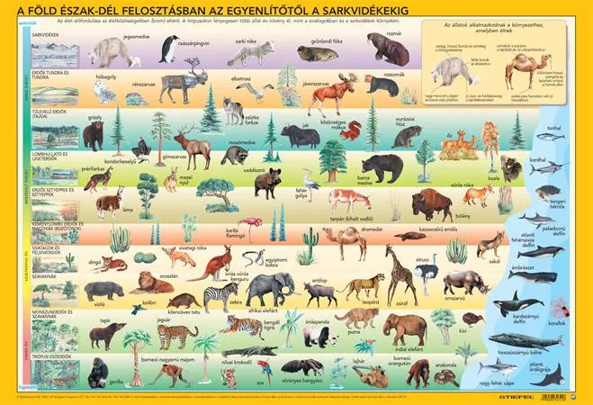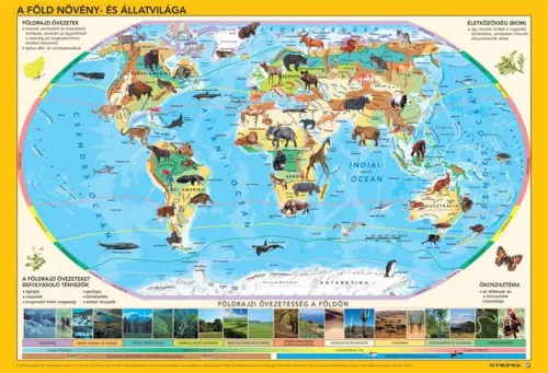 „A Föld állat- és növényvilága című könyöklő élethű, művészi pontossággal készült, egyedi rajzokkal mutatja be földünk állatvilágát, ügyesen egyensúlyozva a jól ismert fajok és a különlegességek felvonultatása között. Az állatrajzokat egy hiteles, jól használható világtérképen helyeztük el, amely egyszersmind bemutatja Földünk „övezetességeit” is – a tundrákat, tajgákat, sivatagokat és a többit –, azaz az éghajlati sajátosságok alapján kialakult növénytakarót, és az ezekből következő sajátos ökoszisztémát. Így könyöklőt nézegetve, akár gyermek, akár felnőtt felhasználóról is legyen szó, a biológia- vagy földrajzórán elhangzó, elsőre homályosnak tűnő fogalmak is egyből világossá válnak. A termék alján látható, élőhelyenkénti jellegzetes kis fényképek szintén a jobb megértést szolgálják. A könyöklő hátoldalán, a még jobb tisztánlátás végett, világtérkép nélkül, nagyobb méretben, az égövek szerint sorba rakva láthatjuk az előoldalon szerepeltetett állatrajzokat.”