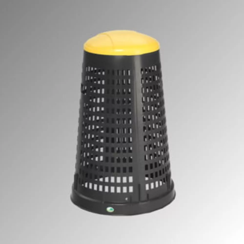 Kosártartó 120 literes szemeteszsákokhoz, műanyag, fekete, szorítógyűrűvel és sárga fedéllel, átmérő x magasság 380/525x880 mm
