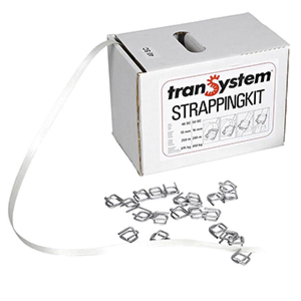 Kraftszalag pántolószalag, poliészter, ragasztott 13 mm, 3750 n, adagolódoboz 250 méterrel (kis tekercs), 100 csattal