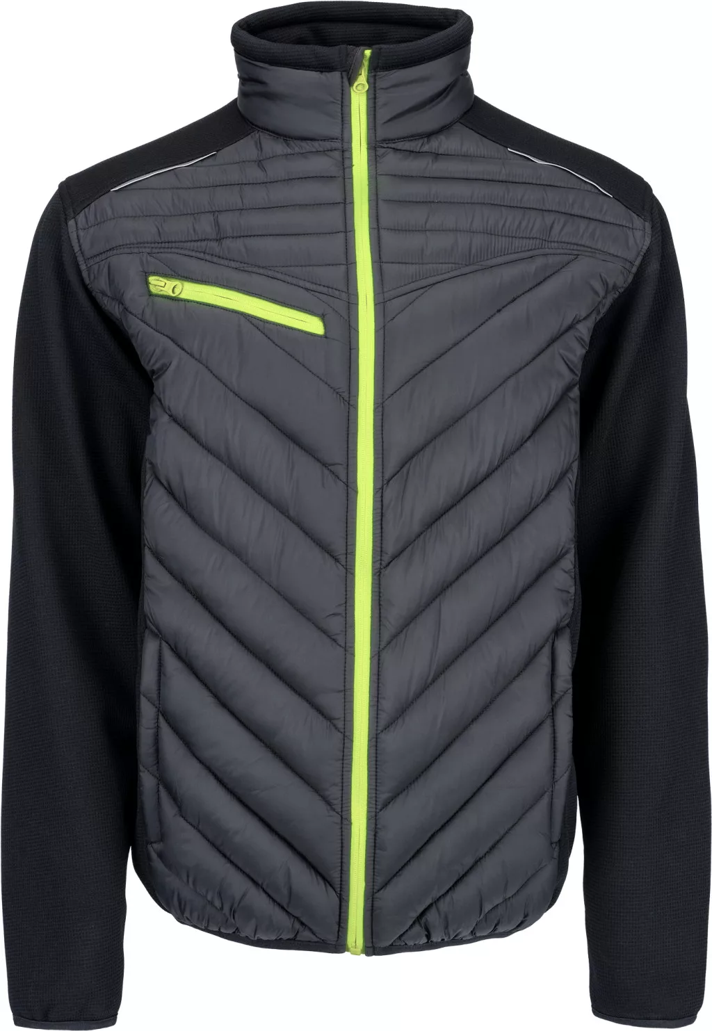 • dzseki steppelt anyag és kötött ujjak kombinációjával • jól láthatósági színkiemelés és fényvisszavető részletek • 2 oldalzseb • cipzáras mellzseb