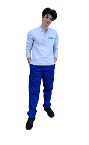 * királykék, 350 g/m2-es, lángmentesített, 100% pamut alapanyagú, minősített hő és láng ellen védő szövet* biztonsági varratok kettős lánc-, plusz 3 fonalas szegőöltéssel* mindenhol fedett hőálló teflon gombok, a zsebeken tépőzáras zsebfedők, vagy a zsebek nyílása függőleges irányú, így megakadályozzák a szikrák és forró fémcseppek bejutását* enyhén szűkülő szárú, rejtett gombolás, 6 erősített övtartó, két függőleges nyílású biztonsági foltzseb