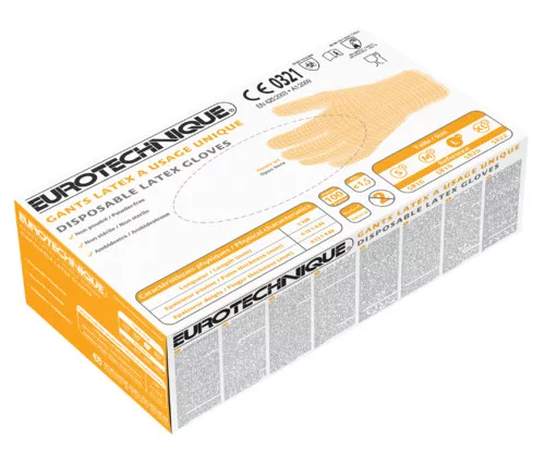 100 darabos természetes latex, púdermentes, 0,125mm vastagságú, hajtott mandzsettájú vizsgálókesztyűAQL: 1,5
