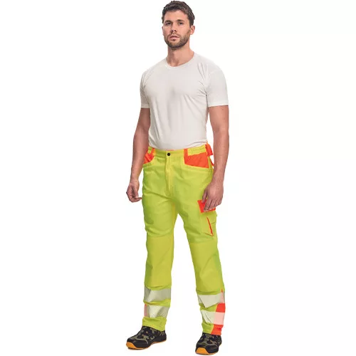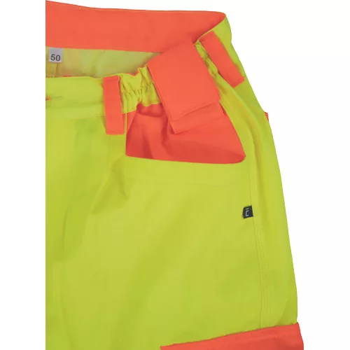 • férfi nadrág két attraktív jólláthatósági szín kombinációjában fényvisszavető csíkkal • 2 nagy első zsebbel • 2 multifunkcionális oldalzseb • 2 hátsó zsebfedős zsebbel • rugalmas derékpánt • kalapácstartó