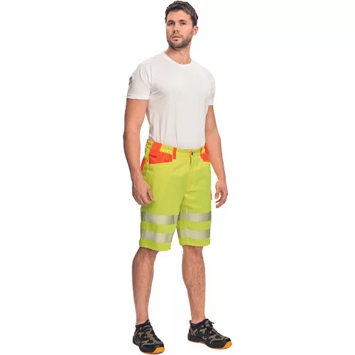 • férfi rövidnadrág két attraktív jólláthatósági szín kombinációjában fényvisszavető csíkkal • 2 nagy első zsebbel • 1 multifunkcionális oldalzseb • 2 hátsó zsebfedős zsebbel • rugalmas derékpánt • 2 kalapácstartó