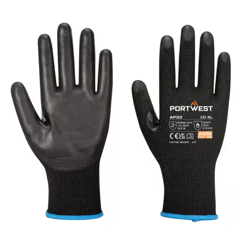 A kényelmes, 15 gauge B vágásbiztos kötés kiváló kézügyességet biztosít, és második bőr érzetet nyújt. A PU tenyérbevonat biztonságos tapadást biztosít száraz körülmények között. Megerősített hüvelyk- és mutatóujj közötti terület a nagyobb tartósság érdekében. A legtöbb érintőképernyős eszközzel működik.