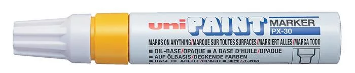 Az UNI PX-30 festő lakkfilc a markerek  markere, a maga sokoldalúságával. -olaj és kitörölhetetlen pigment tinta az alapja, ezáltal rajzolhatunk és színezhetünk vele majdnem minden felületre – lehet az porózus vagy sima, poros, zsíros, nedves, nyers, stb. -ellenáll a víznek, fénynek, hidegnek és hőnek 250˙C-ig, ezért mind ipari, mind DIY célokra kedvelt eszköz, bel- és kültéri használatra egyaránt -nagy fedőképességű lakkfilc, ipari jelölő, és kreatív területekre egyaránt ajánlott -minden felületen víz, hő, és UV-álló az íráskép -szalagon, szöveten az oldószer nem hagy nyomot -alumínium tollszárban gazdaságos tintaadagolással, cserélhető heggyel -tinta színével megegyező kupakkal rendelkezik -írásvastagság: 4,0-8,5mm