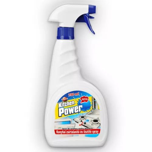 Laro Kitchen Power általános konyhai zsírtalanító és tisztítószer, szórófejes flakonban. Kiszerelés: 750 ml/flakon.Összetevők a mosó és tisztítószerekről szóló 1272/2008/EK rendelet szerint: izopropilalkohol <5%, metoxipropanol <5%, kationos tenzid <5%, amfoter tenzid <5%, monoetanolamin <5%, nátrium hidroxid <1%, Na EDTA <1%, parfum <1%.Csomagolás: 1 db, gyűjtőcsomagolás: 12 db.