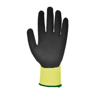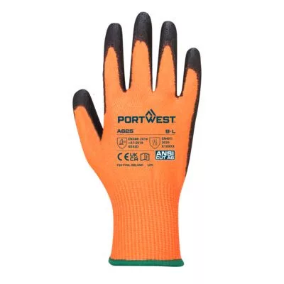 D szintű vágásbiztosságot garantáló védőkesztyű PU bevonattal, jól láthatósági színekben. A HPPE alapanyag 1-es szintű kontakt hő elleni védelmet biztosít.