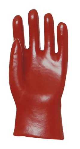 Varrás nélküli, poliészterrel megerősített kesztyűTeljes felületén piros PVC-vel mártvaHosszú mandzsettájú, teljes hossza: 27cm