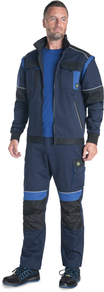 • férfi munkakabát cipzárral, takart patentes borítással • 2 oldalzseb • 2 tépőzáras mellzseb • megerősített vállrészek • levehető ujjak rugalmas mandzsettákkal • rugalmas derékpánt • fényvisszavető részletek