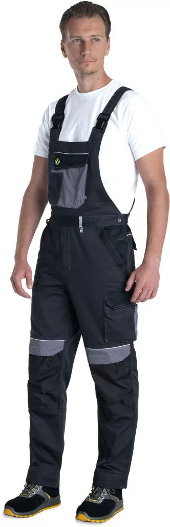 • férfi munkás mellesnadrág rugalmas derékpánttal • 2 oldalzseb • 1 combzseb • 1 mellzseb tépőzárral • 2 hátsó zseb tépőzárral