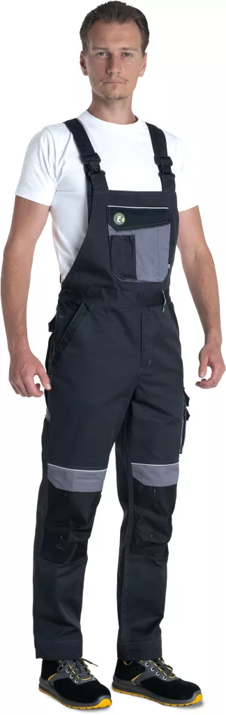• férfi munkás mellesnadrág rugalmas derékpánttal • 2 oldalzseb • 1 combzseb • 1 mellzseb tépőzárral • 2 hátsó zseb tépőzárral