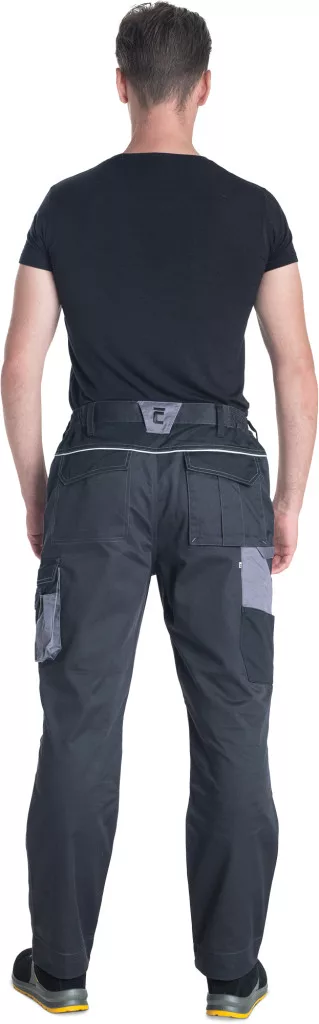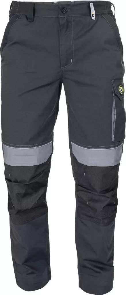 • férfi munkanadrág rugalmas derékpánttal • 2 oldalzseb • 1 bal combzseb • 2 hátsó zseb tépőzárral • térdrész erősítés opcionálisan behelyezhető térdpárnával • fényvisszavető részletek • állítható szárhossz