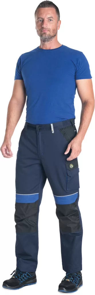 • férfi munkanadrág rugalmas derékpánttal • 2 oldalzseb • 1 bal combzseb • 2 hátsó zseb tépőzárral • térdrész erősítés opcionálisan behelyezhető térdpárnával • fényvisszavető részletek • állítható szárhossz