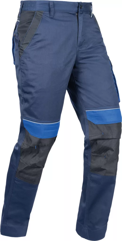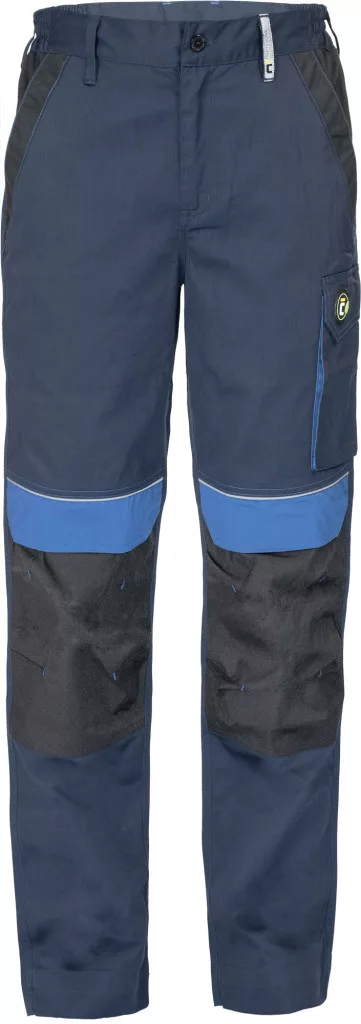 • férfi munkanadrág rugalmas derékpánttal • 2 oldalzseb • 1 bal combzseb • 2 hátsó zseb tépőzárral • térdrész erősítés opcionálisan behelyezhető térdpárnával • fényvisszavető részletek • állítható szárhossz