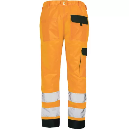 • női HI-VIS munkanadrág rugalmas derékrésszel • 2 oldalzseb • 1 combzseb • 2 hátulsó zseb tépőzárral • 2 bevarrt, 7,5 cm széles fényvisszavető csík a lábszáron • megerősített térdrész • hosszabbítható szárhossz