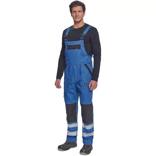 • férfi mellesnadrág rugalmas derékkal, széles pántokkal, műanyag csatokkal • 2 első zseb, 1 oldalzseb, 1 nagy mellzseb, 2 hátsó zseb • megerősített térdrész» fényvisszavető csíkok a szárak alsó részén» leengedhető szárak • anyag: 100% pamut, anyagvastagság: 260 g/m2