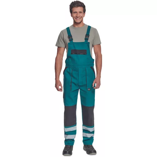 • férfi mellesnadrág rugalmas derékkal, széles pántokkal, műanyag csatokkal • 2 első zseb, 1 oldalzseb, 1 nagy mellzseb, 2 hátsó zseb • megerősített térdrész» fényvisszavető csíkok a szárak alsó részén» leengedhető szárak • anyag: 100% pamut, anyagvastagság: 260 g/m2