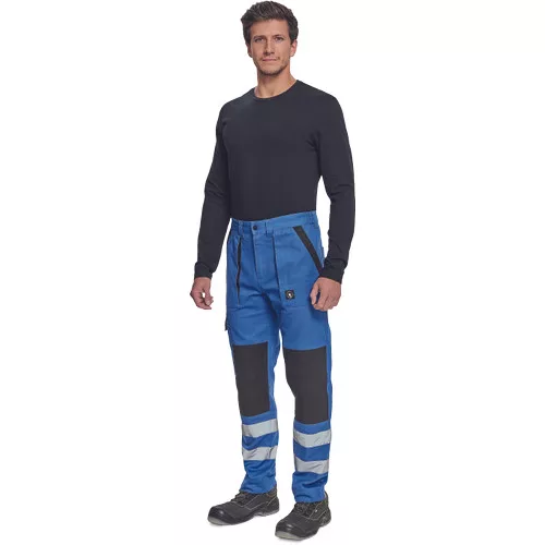 • férfi munkanadrág rugalmas derékkal • 2 első zseb • 1 oldalzseb • 2 hátsó zseb • megerősített térdrész • fényvisszavető csíkok a nadrág alján • a szárak hossza meghosszabbítható • anyag: 100% pamut, anyagvastagság: 260 g/m2