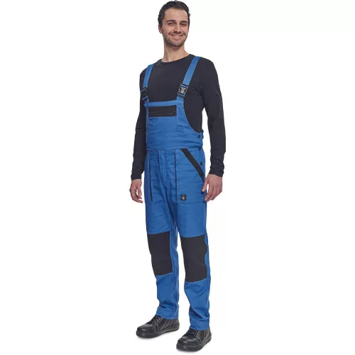 • férfi mellesnadrág rugalmas derékkal, széles pántokkal, műanyag csatokkal • 2 első zseb, 1 oldalzseb, 1 nagy mellzseb, 2 hátsó zseb • megerősített térdrész • leengedhető szárak