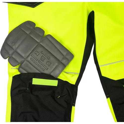 • men's HI-VIS working pants with an elastic waistband • 2 multifunctional flying pockets • 2 printed 7.5 cm wide reflective stripes on bottom legs • Oxford 600D reinforcement at knee areas with optional knee pad insertions • adjustable leg length