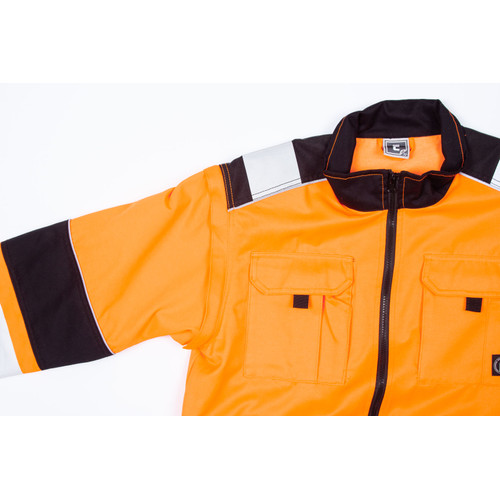 • férfi HI-VIS cipzáras munkakabát levehető ujjakkal • 2 oldalzseb • 2 mellzseb • Oxford 600D megerősítés a váll-és könyökrészeken • 7 cm-es nyomtatott fényvisszavető csík az ujjakon és a test körül derékrészen • rugalmas mandzsetta és alsó szegély • 2 kisebb fényvisszavető csík a vállakon • fényvisszavető szegés