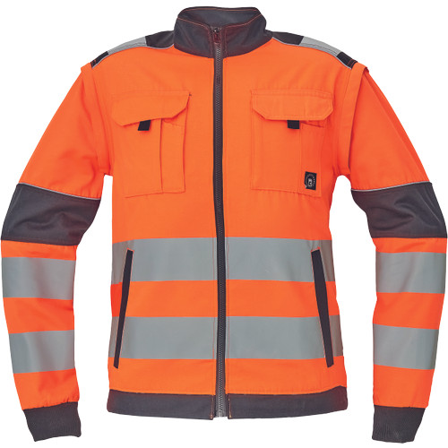 • férfi HI-VIS cipzáras munkakabát levehető ujjakkal • 2 oldalzseb • 2 mellzseb • Oxford 600D megerősítés a váll-és könyökrészeken • 7 cm-es nyomtatott fényvisszavető csík az ujjakon és a test körül derékrészen • rugalmas mandzsetta és alsó szegély • 2 kisebb fényvisszavető csík a vállakon • fényvisszavető szegés