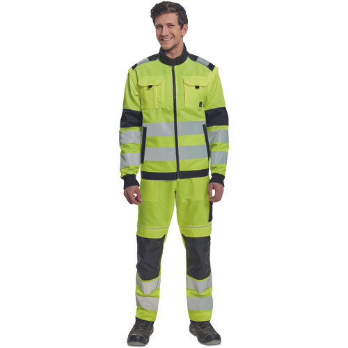 • férfi HI-VIS cipzáras munkakabát levehető ujjakkal • 2 oldalzseb • 2 mellzseb • Oxford 600D megerősítés a váll-és könyökrészeken • 7 cm-es nyomtatott fényvisszavető csík az ujjakon és a test körül derékrészen • rugalmas mandzsetta és alsó szegély • 2 kisebb fényvisszavető csík a vállakon • fényvisszavető szegés