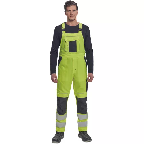 • férfi HI-VIS mellesnadrág rugalmas derékkal, széles pántokkal, műanyag csatokkal • 2 első zseb, 1 oldalzseb, 1 nagy mellzseb, 2 hátsó zseb • 2 kis hátsó zseb a jobb combon • nyomtatott 7,5 cm-es fényvisszavető csík a szárak alján • fényvisszavető szegés • Oxford 600D megerősített térdrész, térdpárna tartó • meghosszabbítható szárak