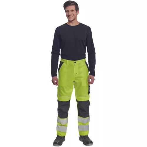• férfi HI-VIS munkanadrág rugalmas derékkal • 2 első zseb, 1 oldalzseb a bal száron, 2 hátsó zseb • 2 kis hátsó zseb a jobb száron • nyomtatott 7,5 cm-es fényvisszavető csíkok a szárak alsó részén • fényvisszavető szegés • Oxford 600D megerősített térdrész, térdvédőtartó • leengedhető szárak