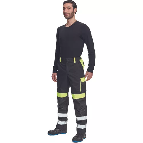 • férfi munkanadrág rugalmas derékkal, meghosszabítható szárakkal • 1 nagy mellzsebbel, 2 első zsebbel, a bal száron 1 dupla zsebbel • a jobb száron 2 kisebb hátsó zsebbel, hátul 2 zsebbel készül • az alsó szárakon két rávarrt fényvisszavető csíkkal van ellátva • megerősített térdrész és térdzseb Oxford 600D anyagból térdvédő behelyezéséhez
